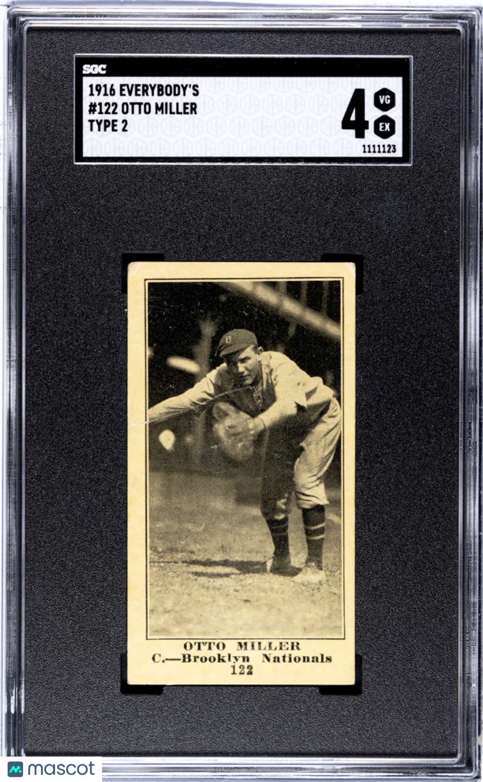 You are purchasing a 1916 Everybody's Otto Miller #122 Type 2 SGC 4. You will receive the exact item in the photographs. Thank you for shopping with Gross Vintage Baseball. Listed With Mascot.