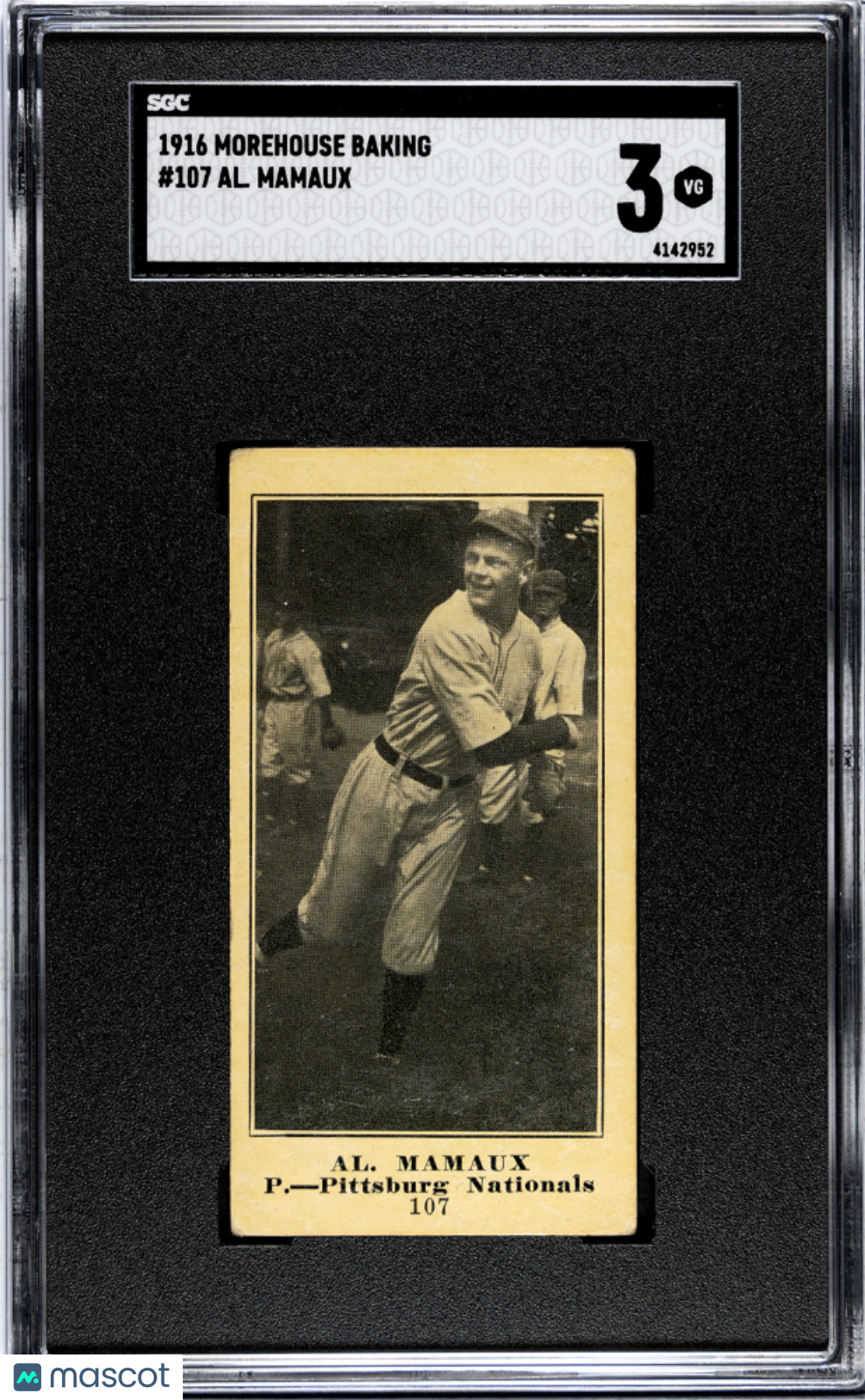 You are purchasing a 1916 Morehouse Baking Al. Mamaux #107 SGC 3. You will receive the exact item in the photographs. Thank you for shopping with Gross Vintage Baseball. Listed With Mascot.