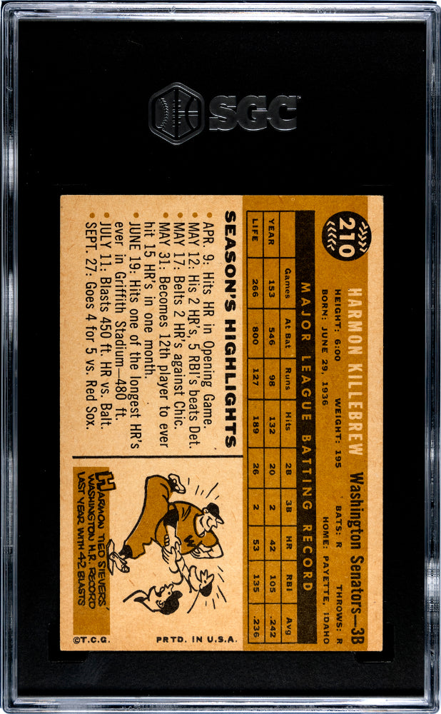 You are purchasing a 1960 Topps Harmon Killebrew #210 SGC 6. You will receive the exact item in the photographs. Thank you for shopping with Gross Vintage Baseball. Listed With Mascot.